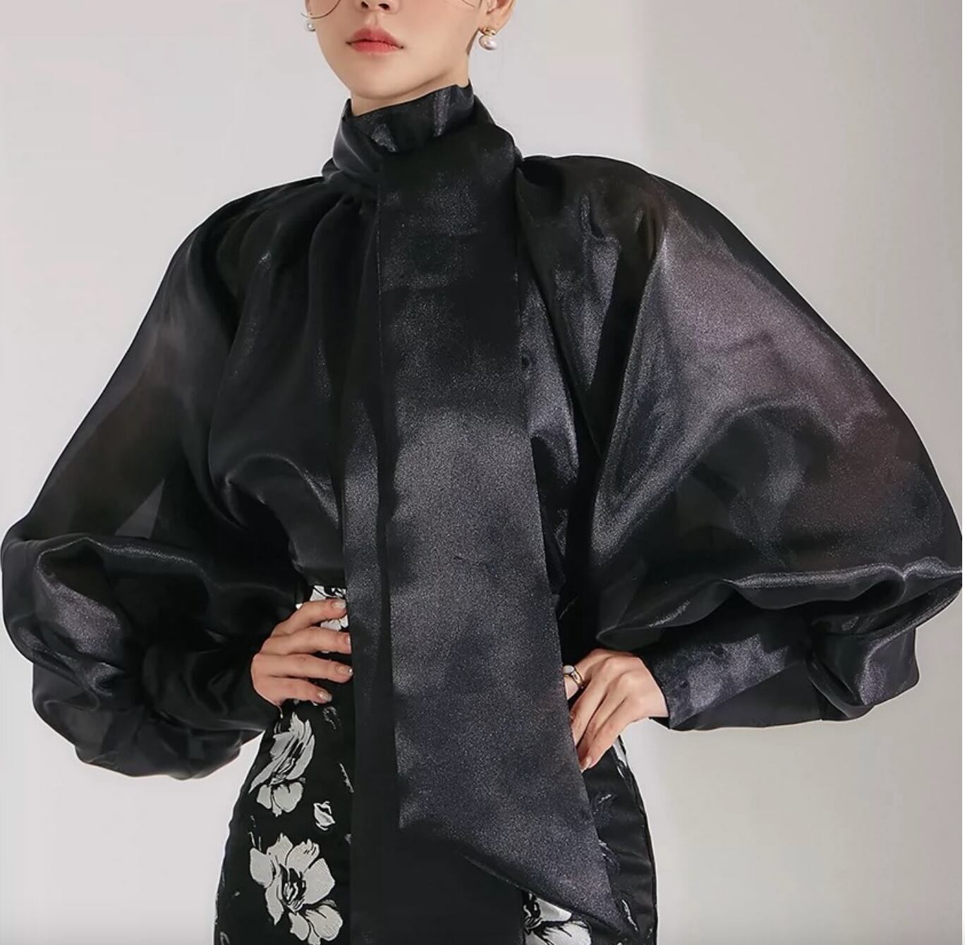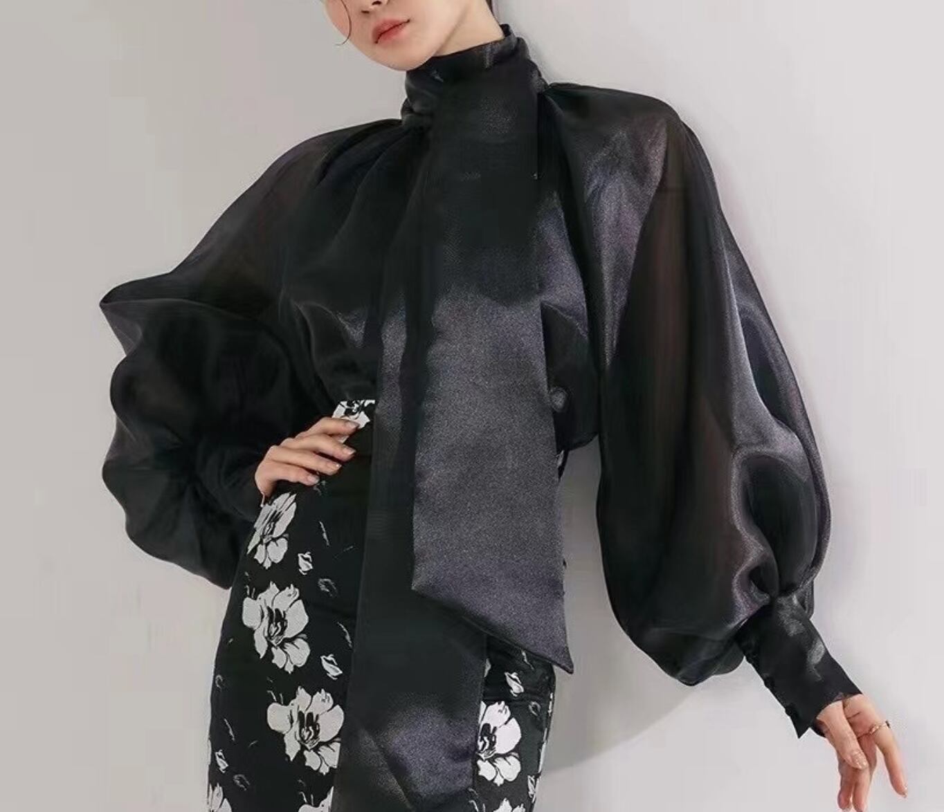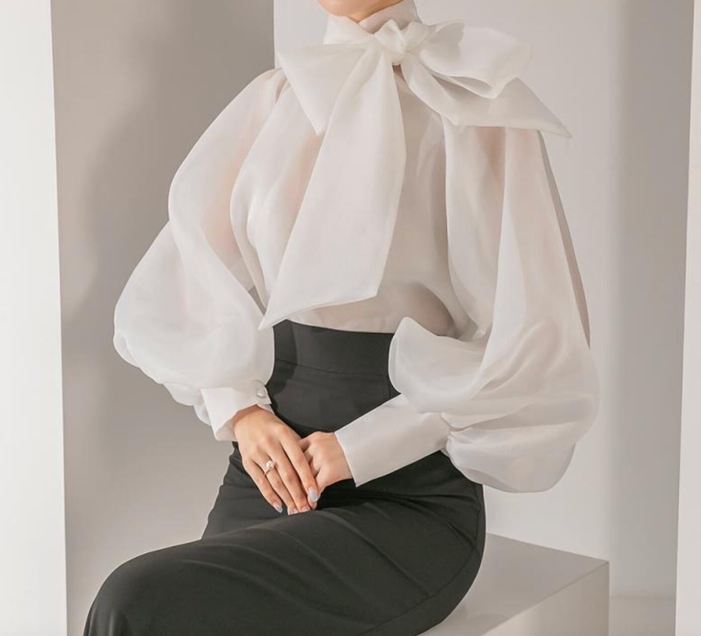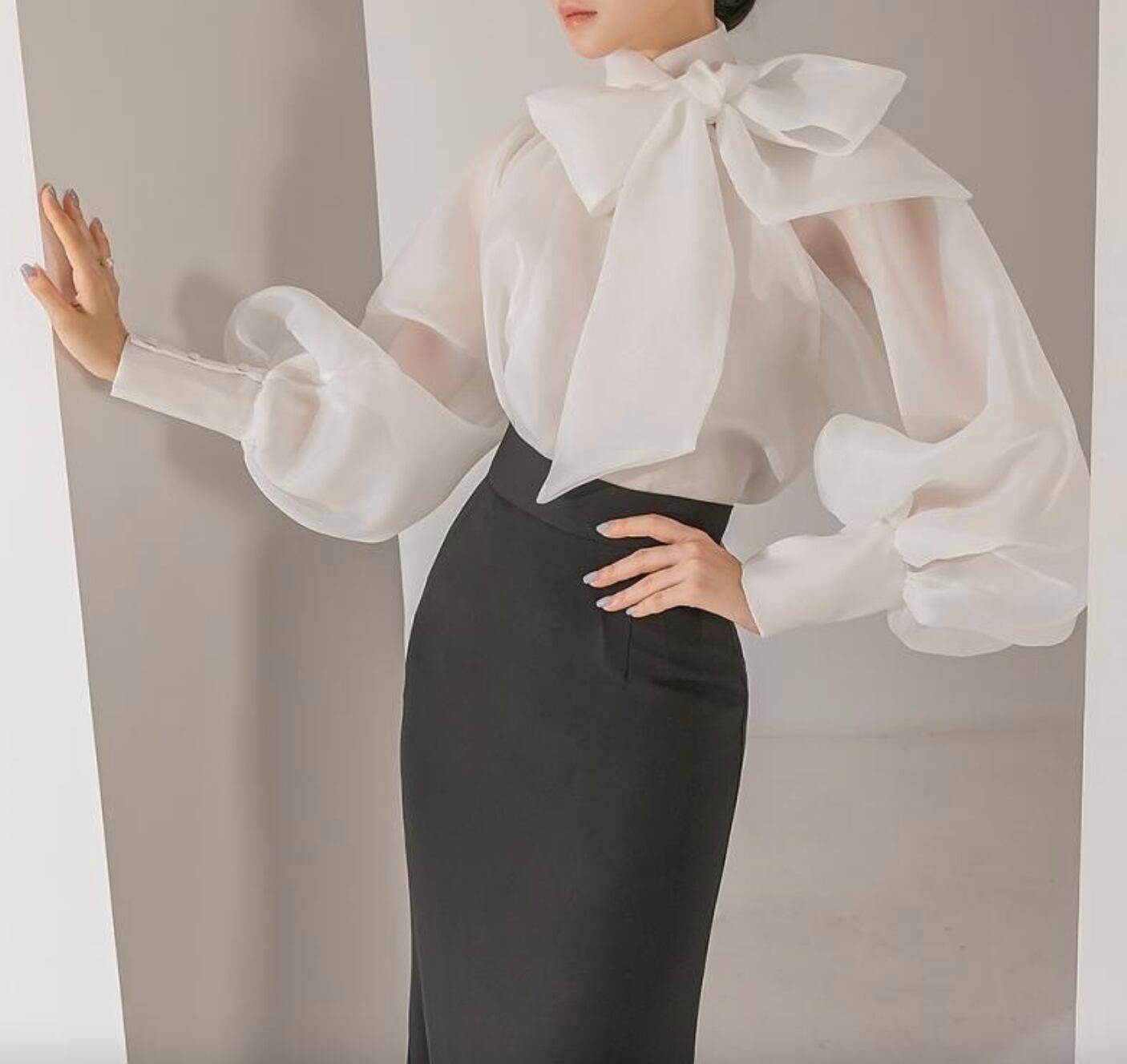 全2色|パフスリーブ シャツブラウス レディース 長袖 コットン混紡 きれいめ 通勤 オフィス ベーシック