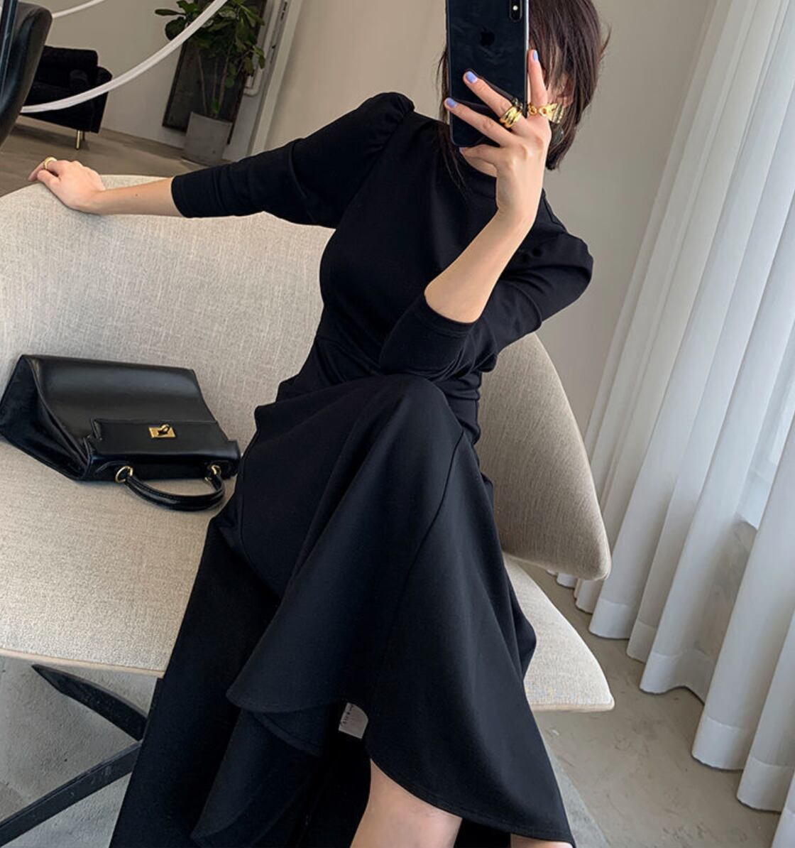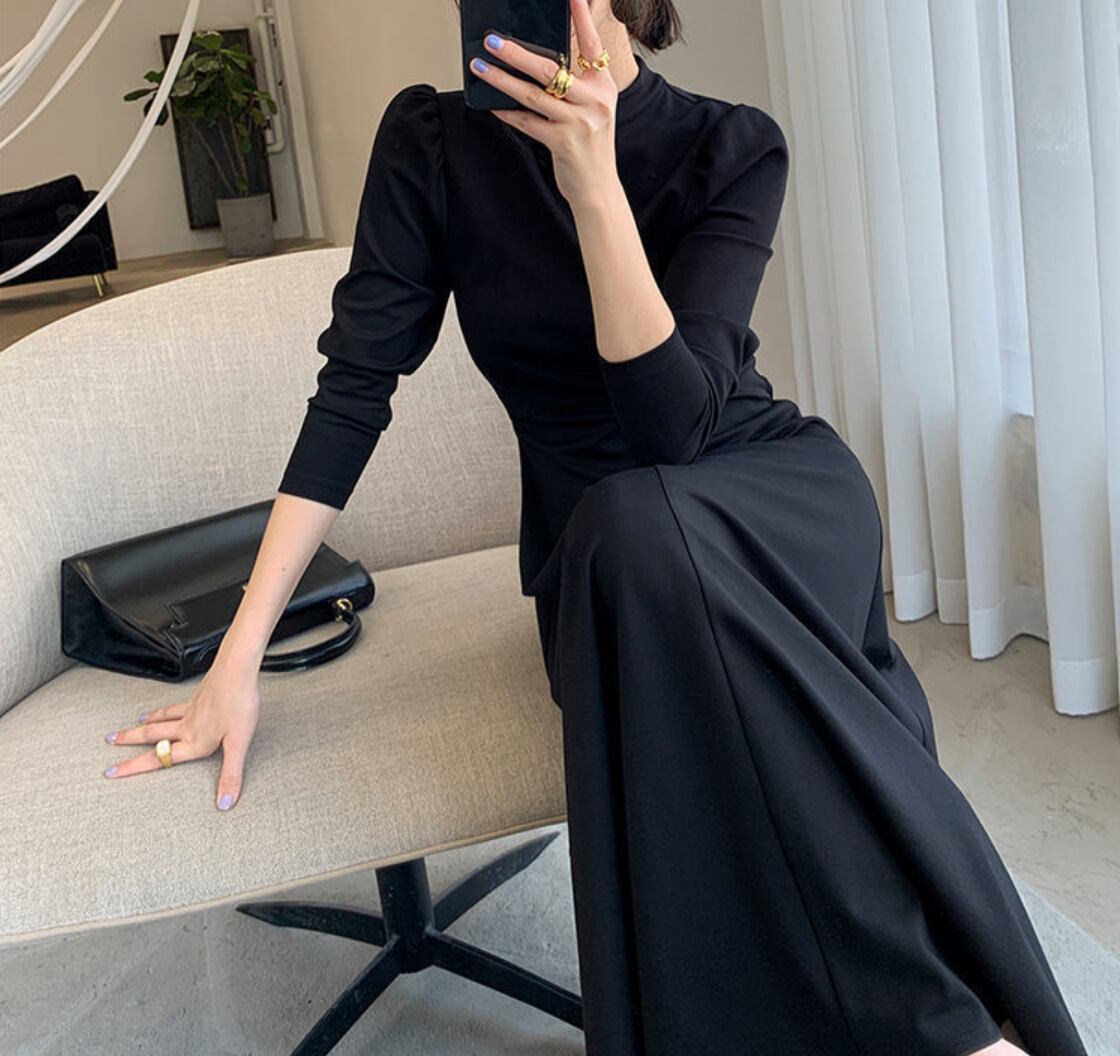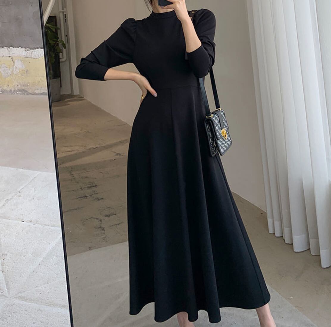 オフィスなどのオンコーデにも、オフコーデにも使いやすいブラックのロングワンピース。