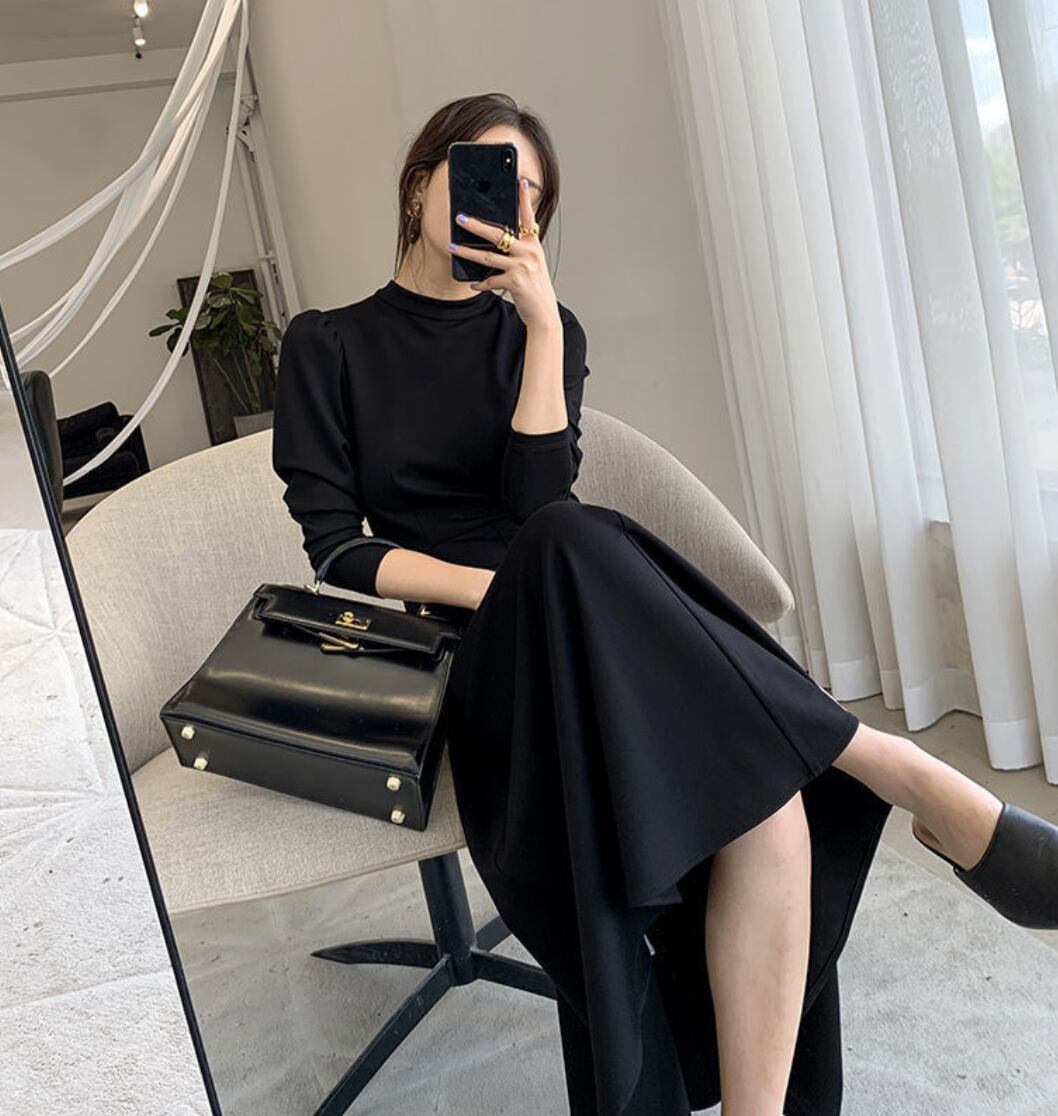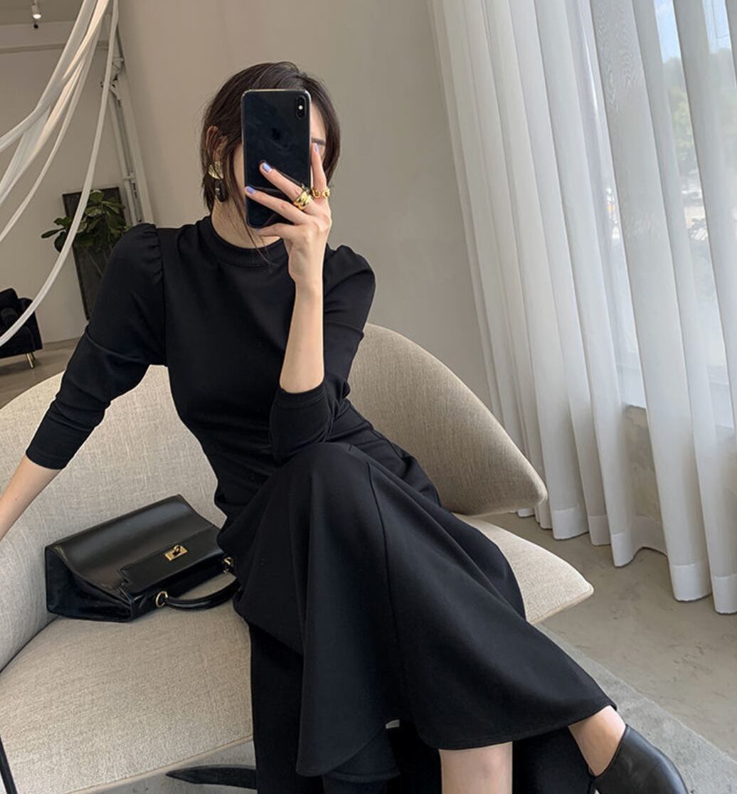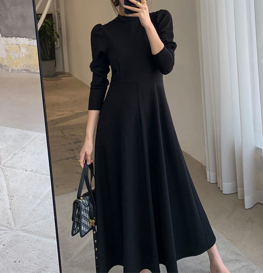 オフィスなどのオンコーデにも、オフコーデにも使いやすいブラックのロングワンピース。