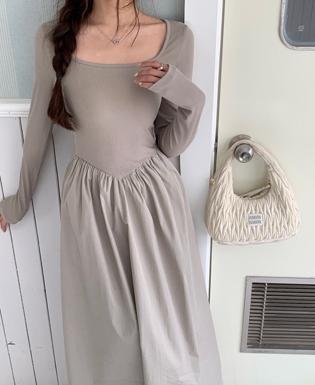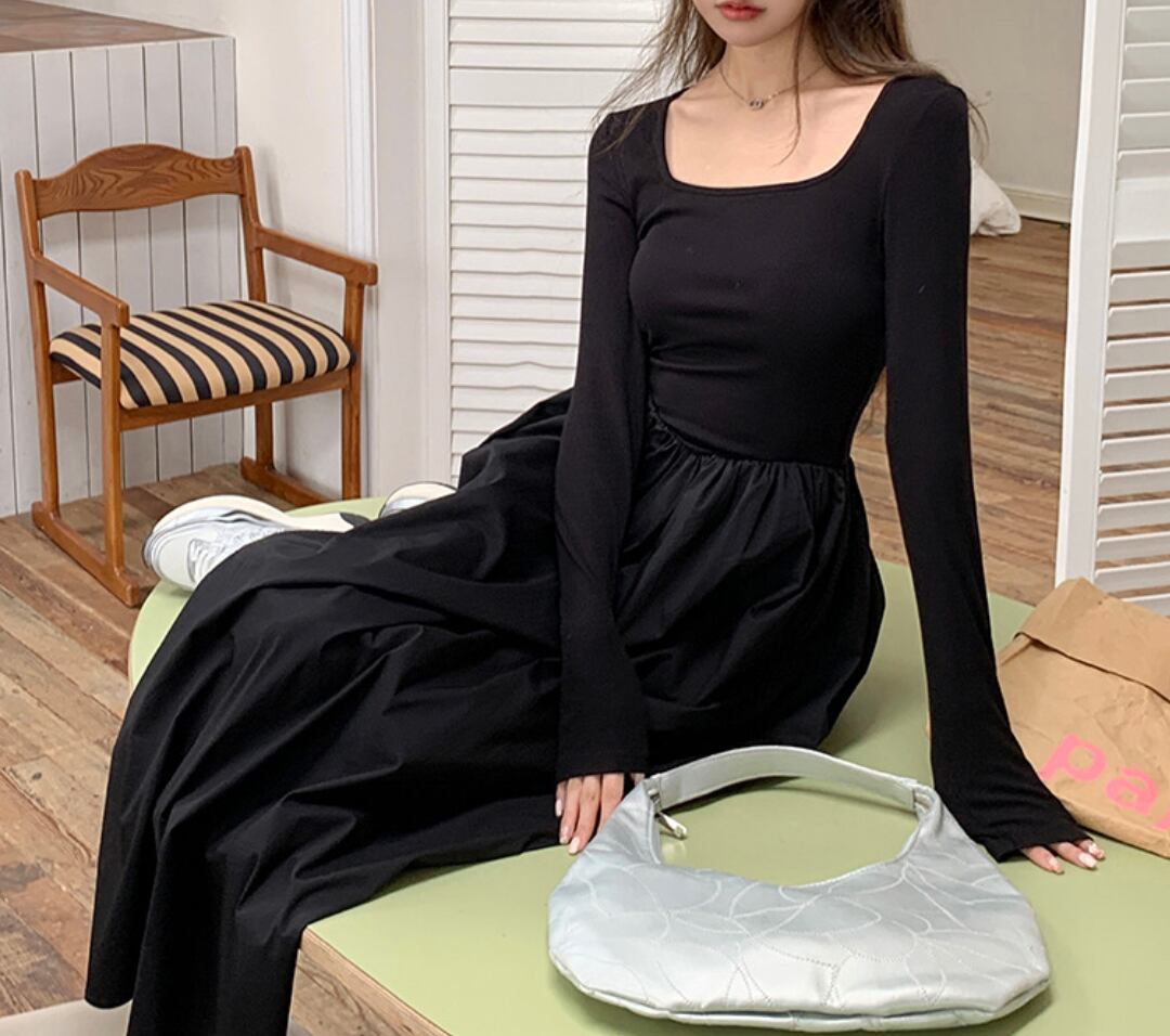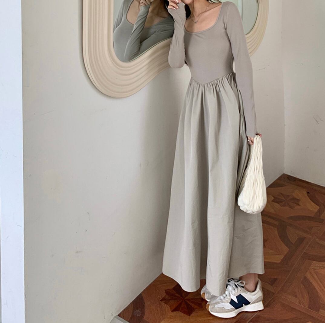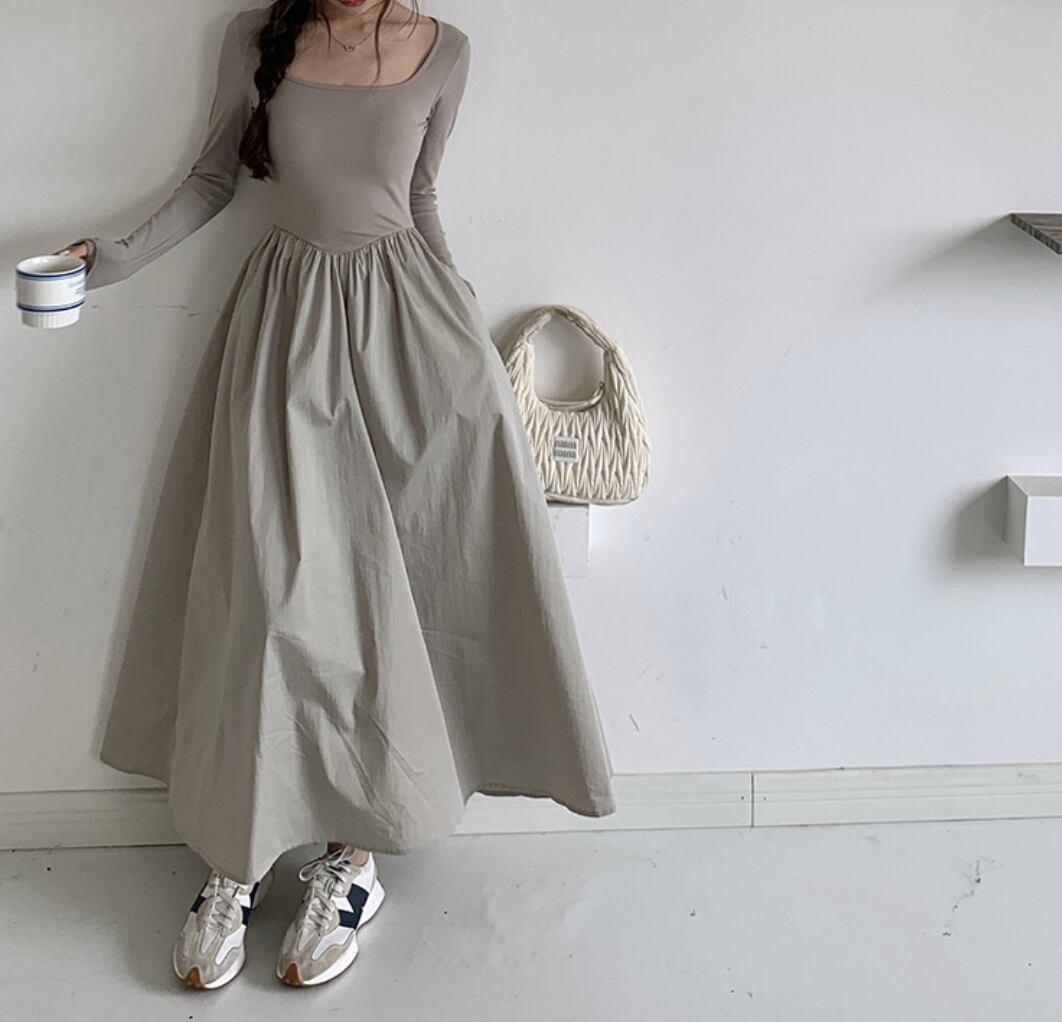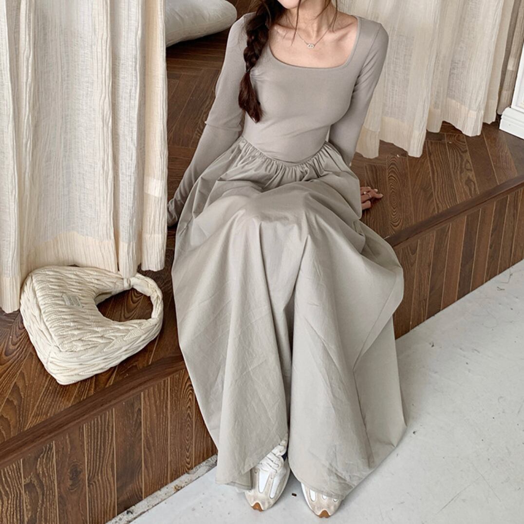 全2色|スクエアネック Aラインロングワンピース|長袖・ポケット付き・きれいめカジュアル