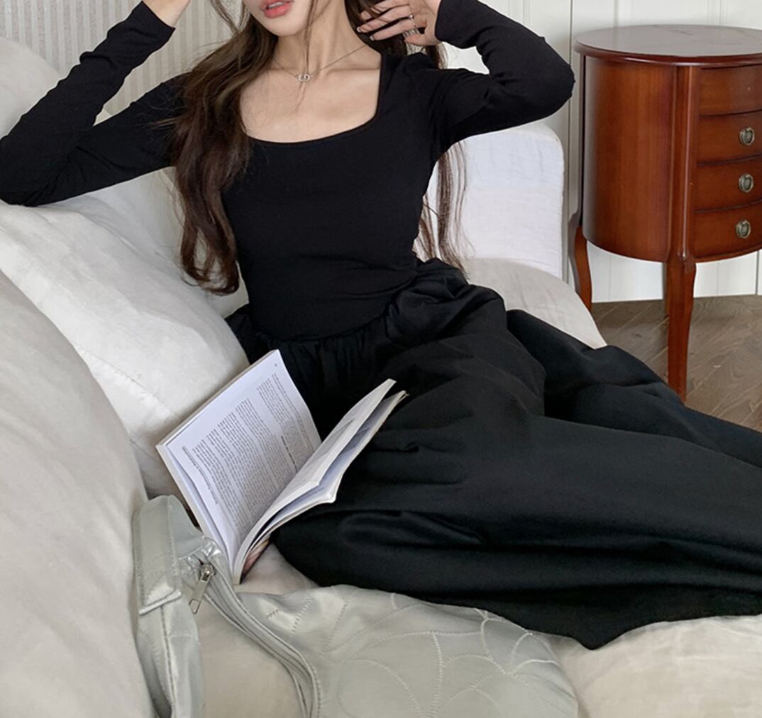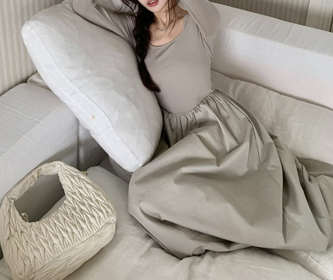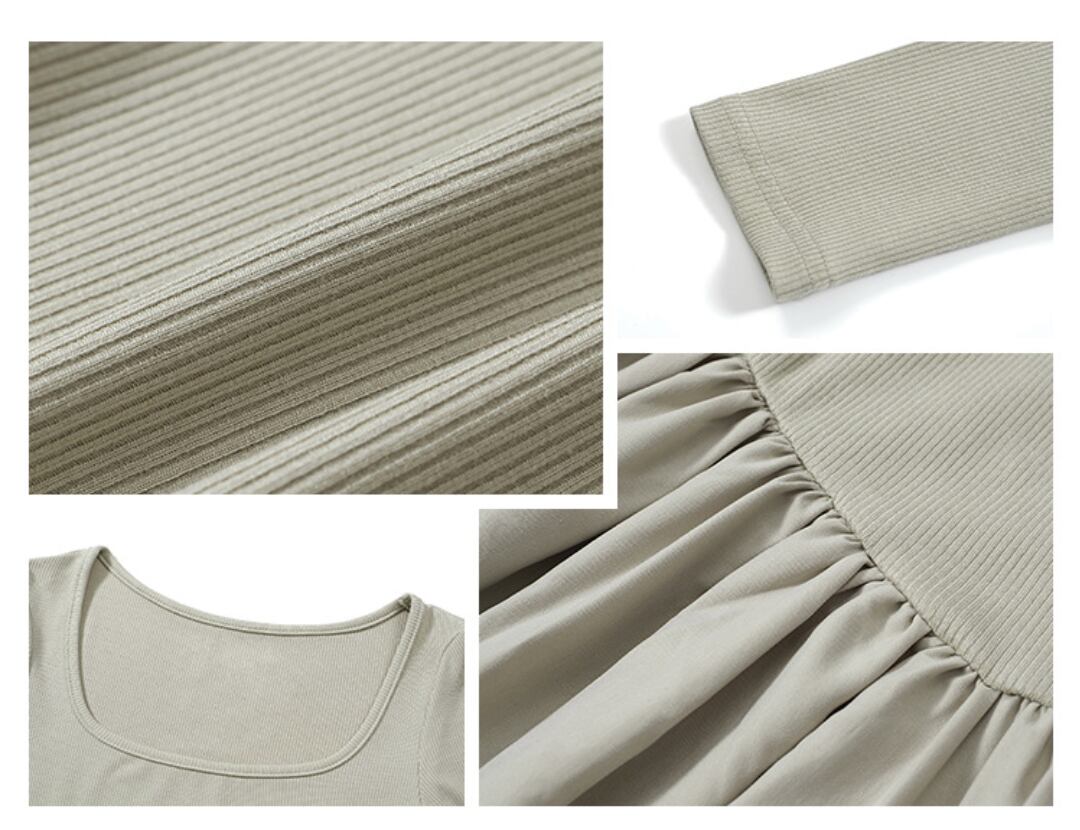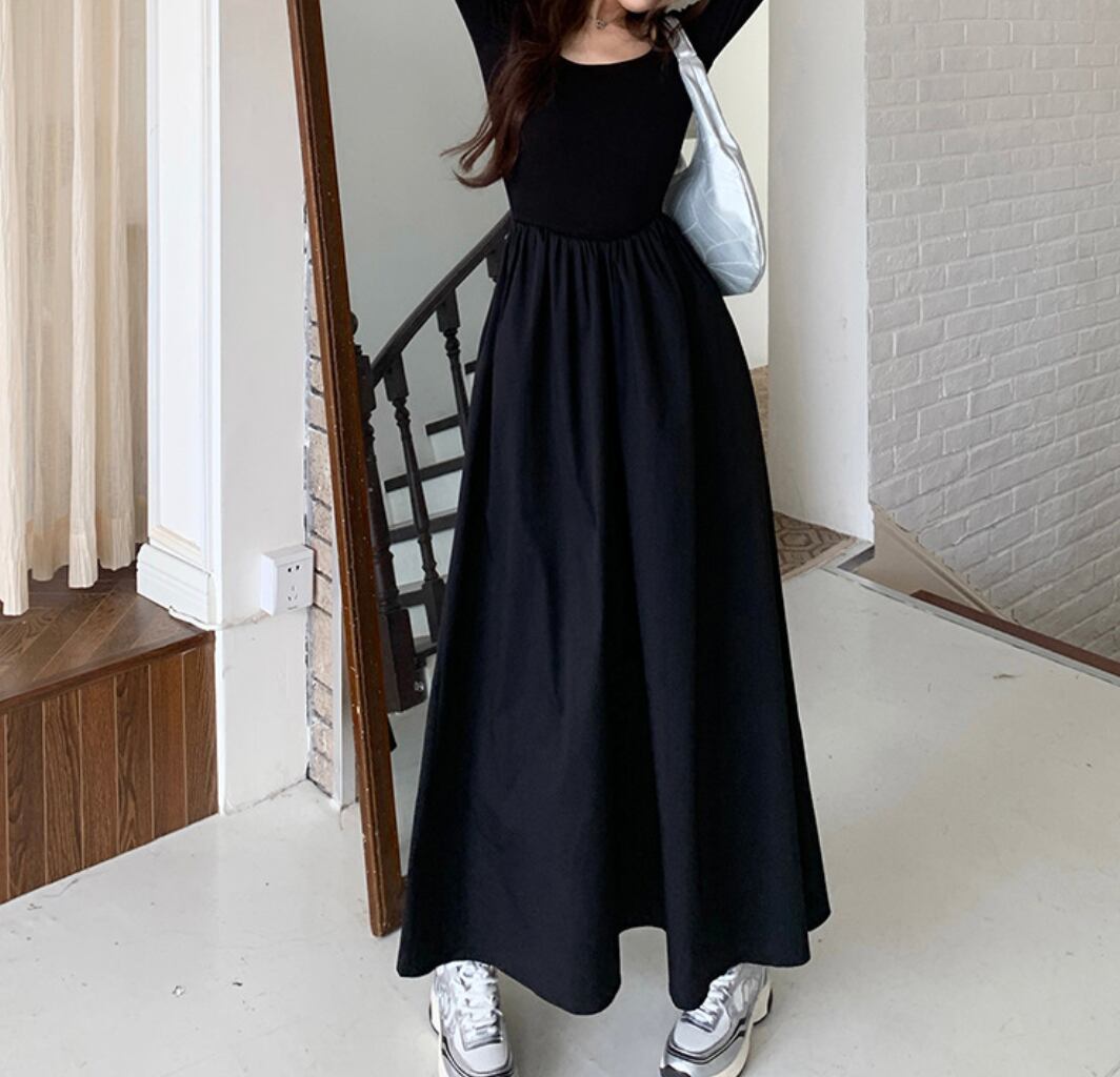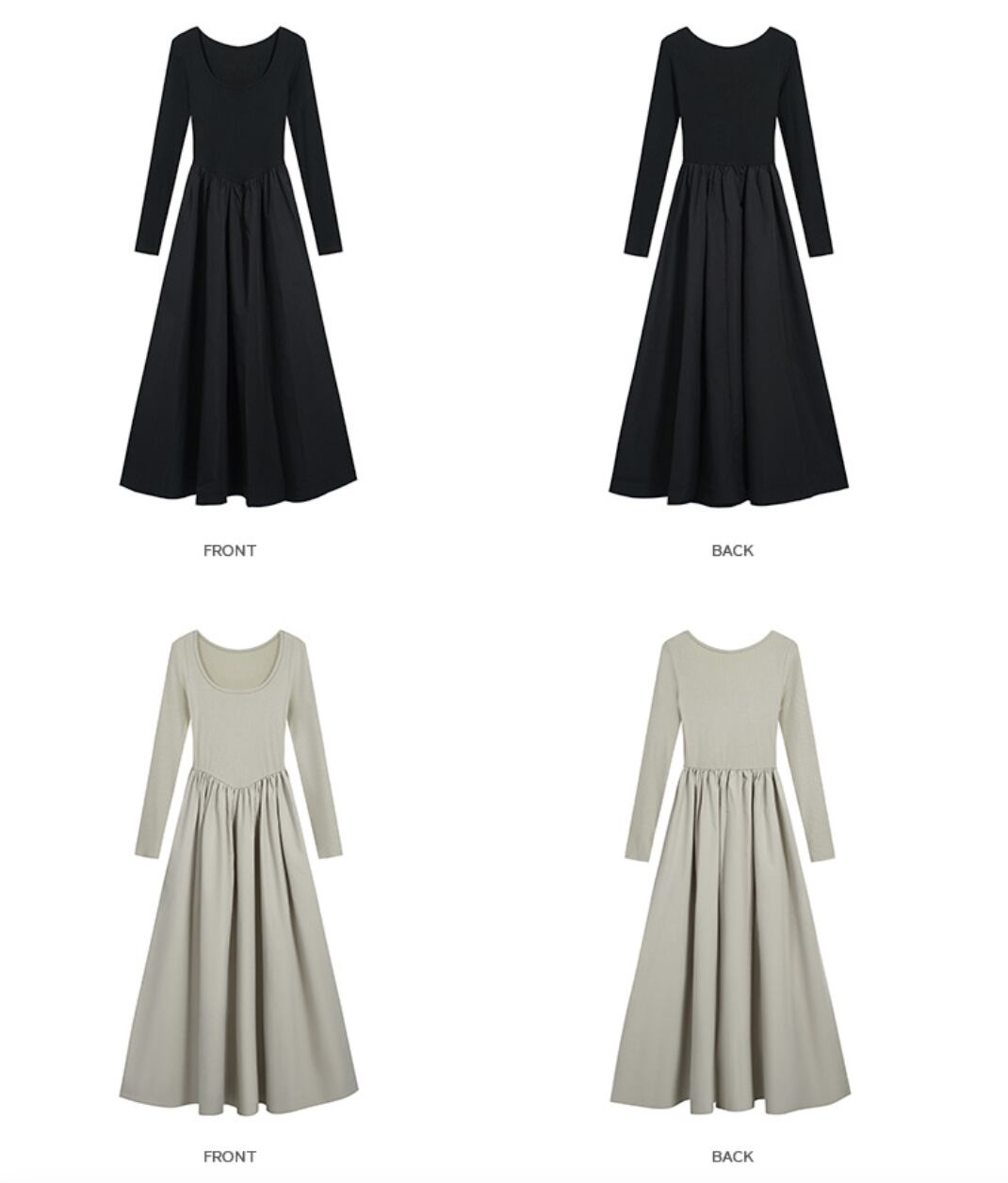 全2色|スクエアネック Aラインロングワンピース|長袖・ポケット付き・きれいめカジュアル