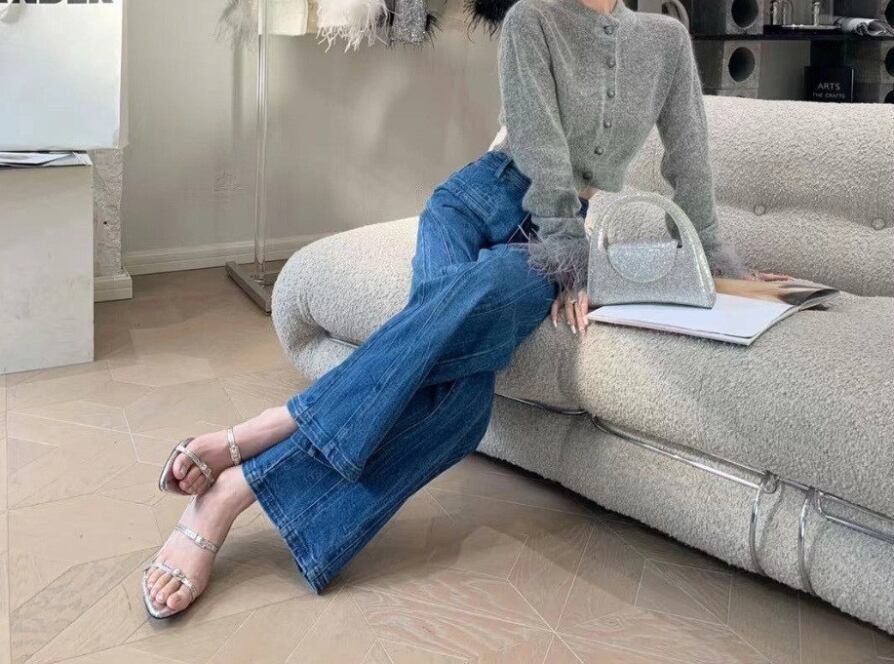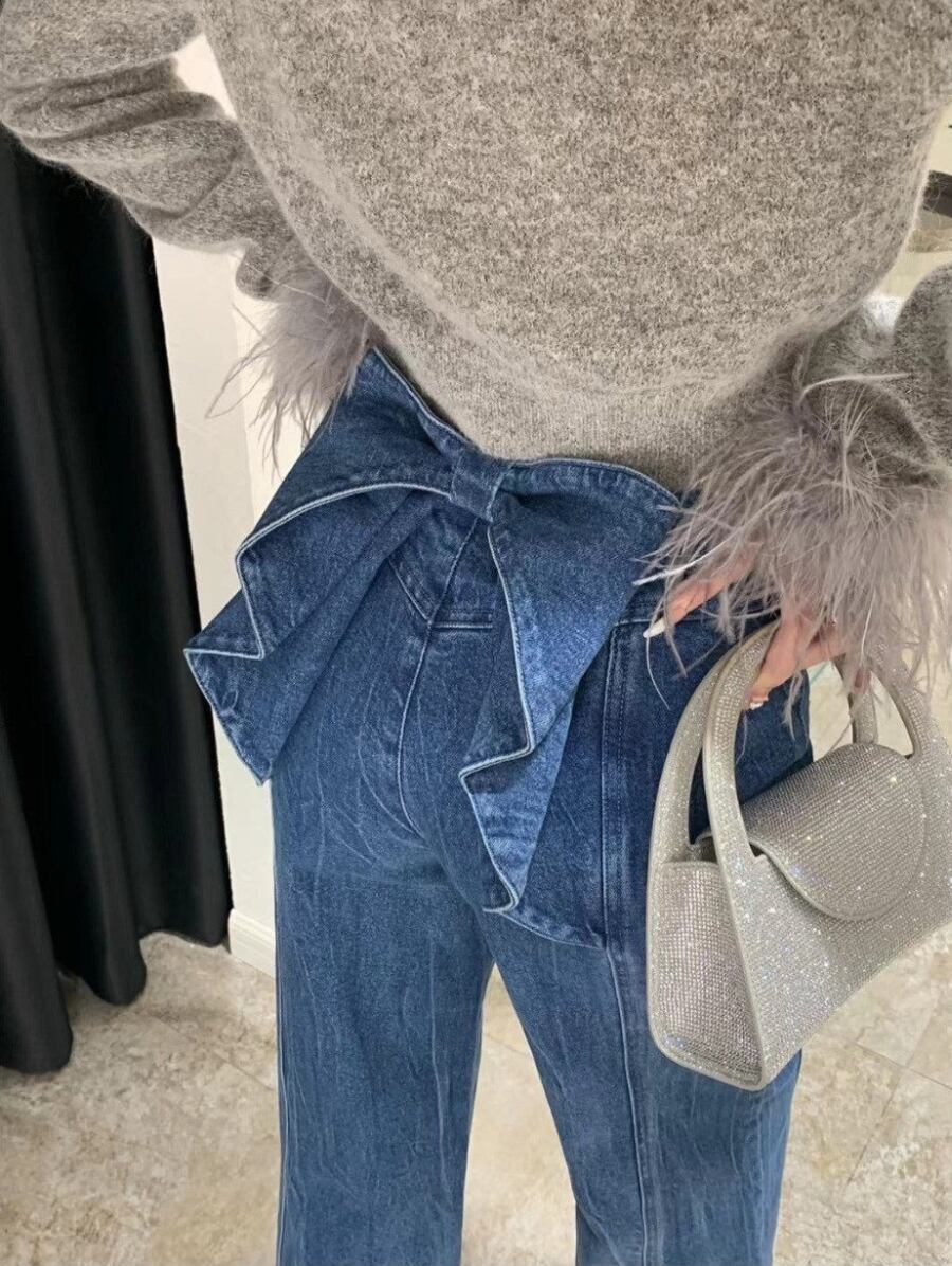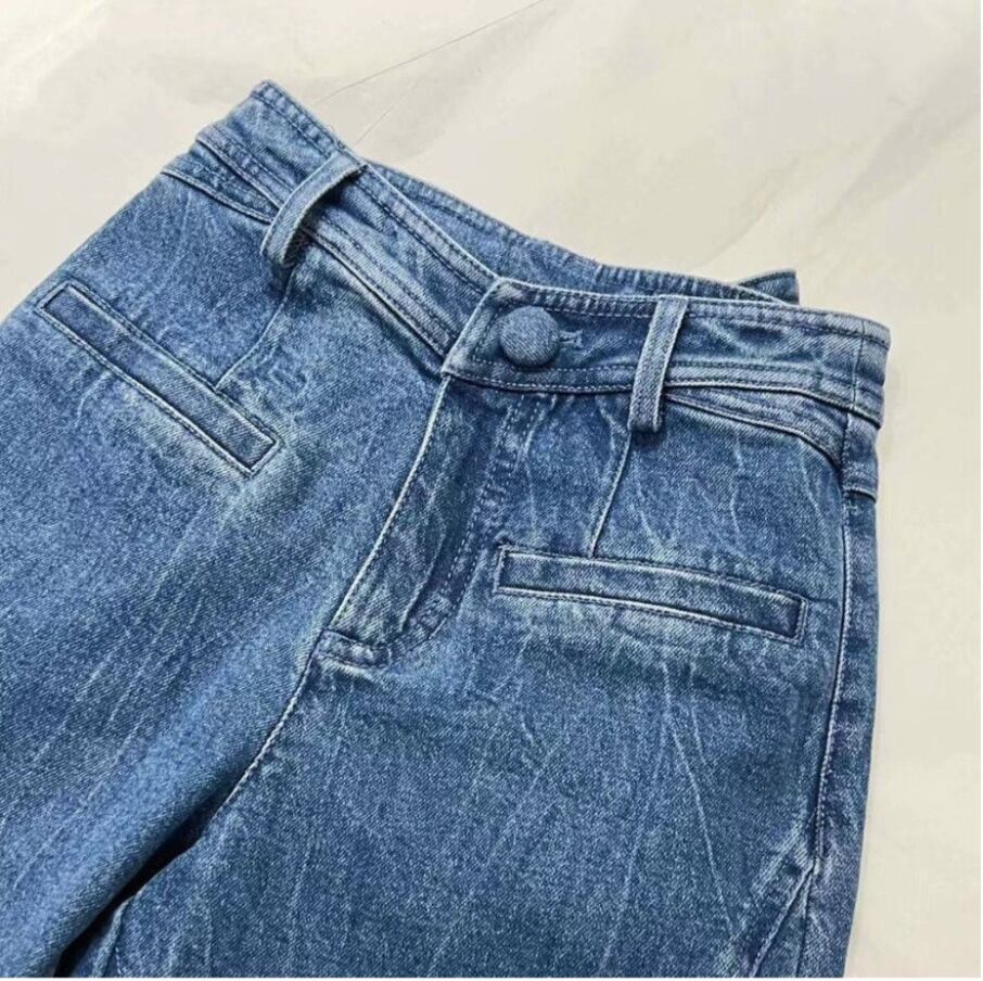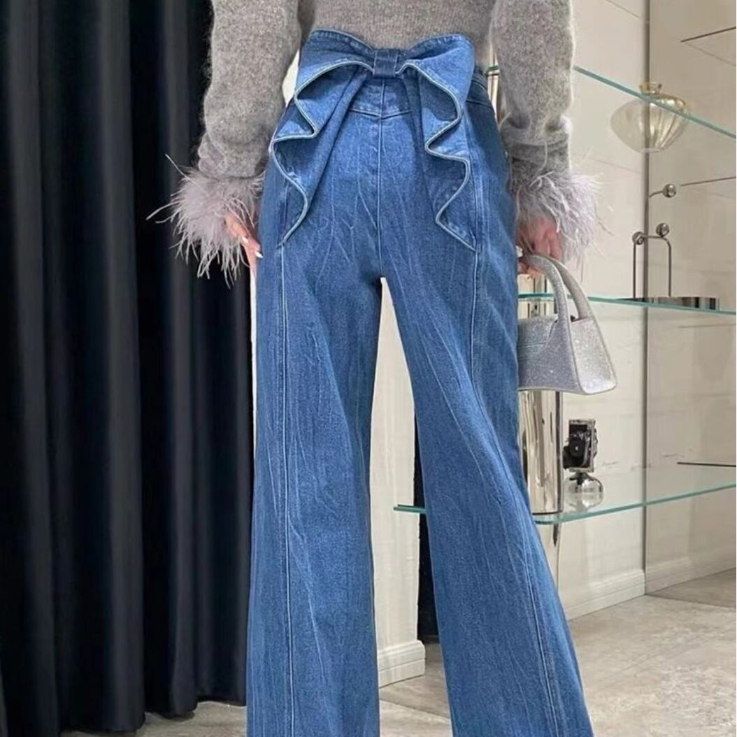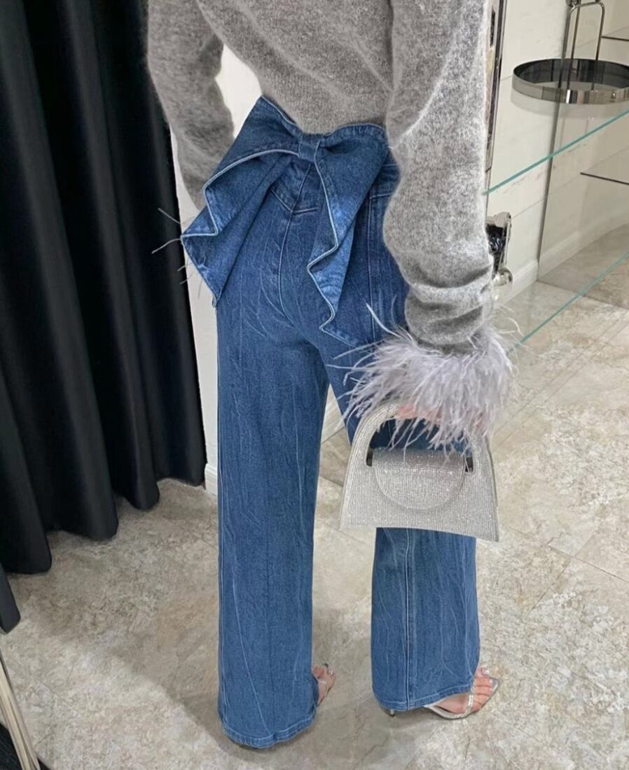 ハイウエスト デニムパンツ レディース|ストレート 微フレア 蝶結び 韓国カジュアル