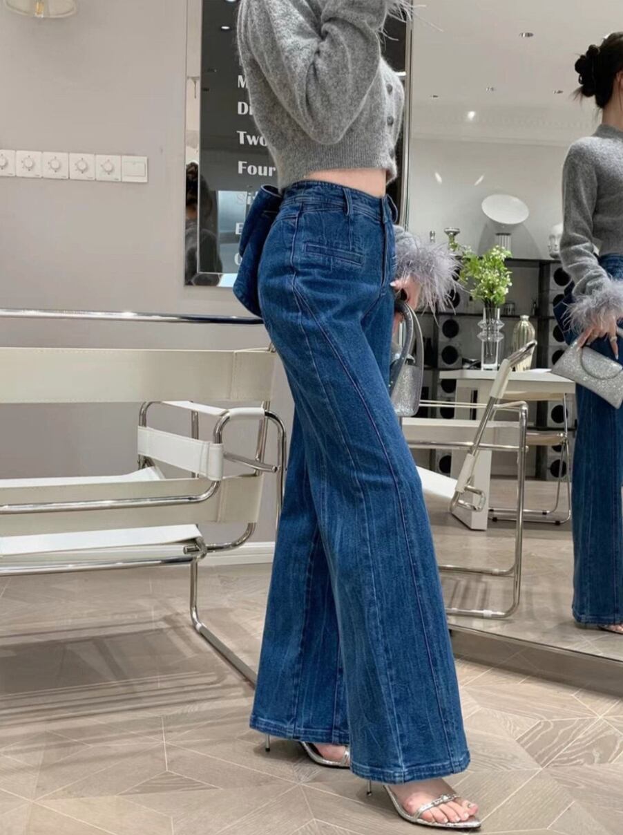 韓国カジュアルスタイルのハイウエストデニムパンツ。