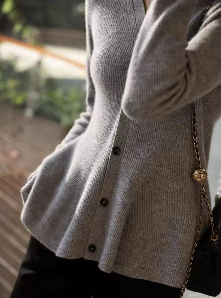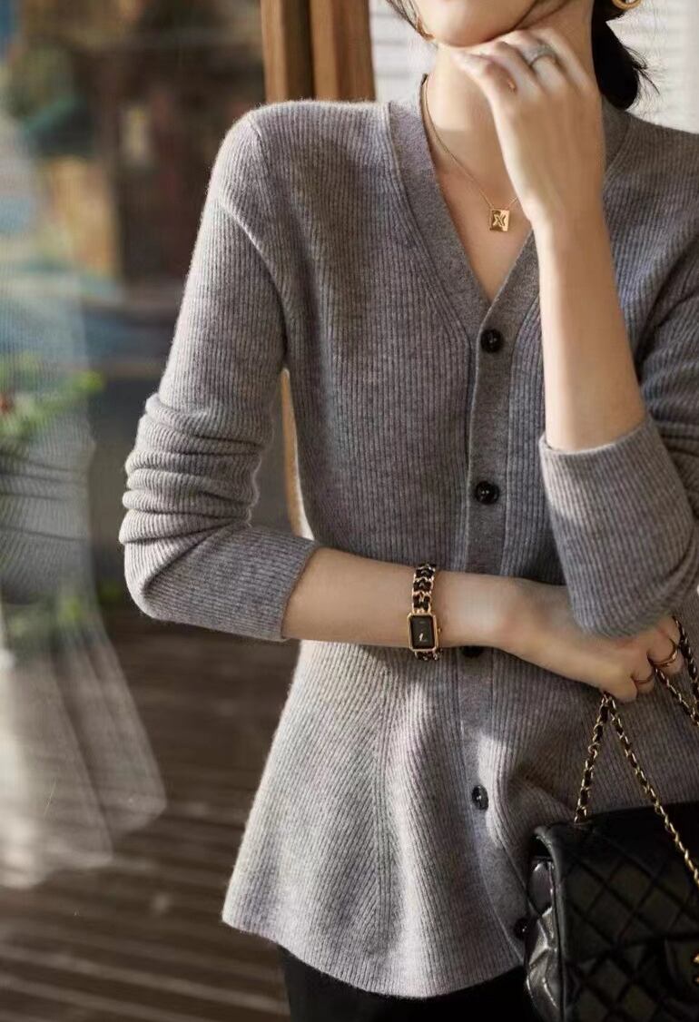 すっきりとしたVネックが首元をきれいに見せ、