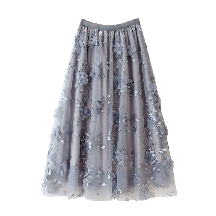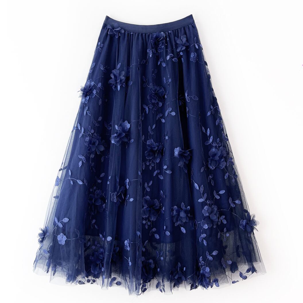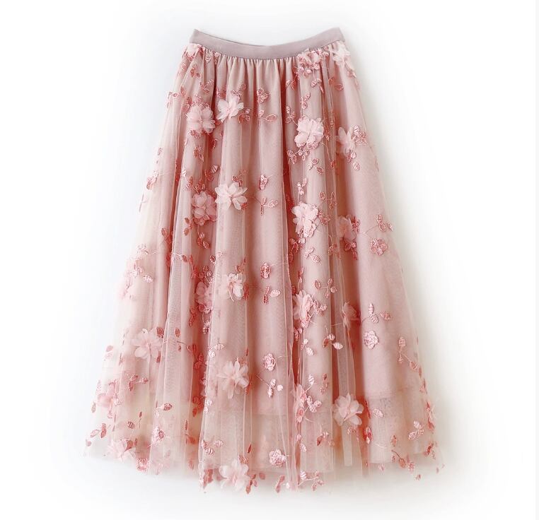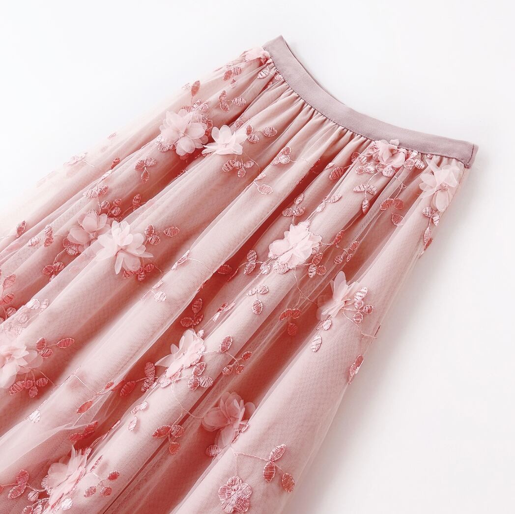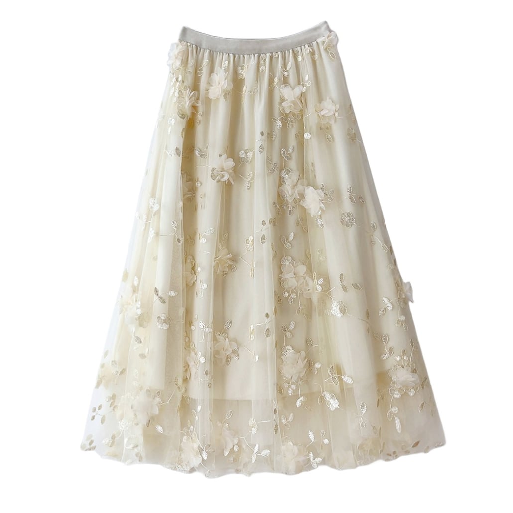 全5色|立体フラワー刺繍チュールスカート|Aライン・ミモレ丈・フェミニン