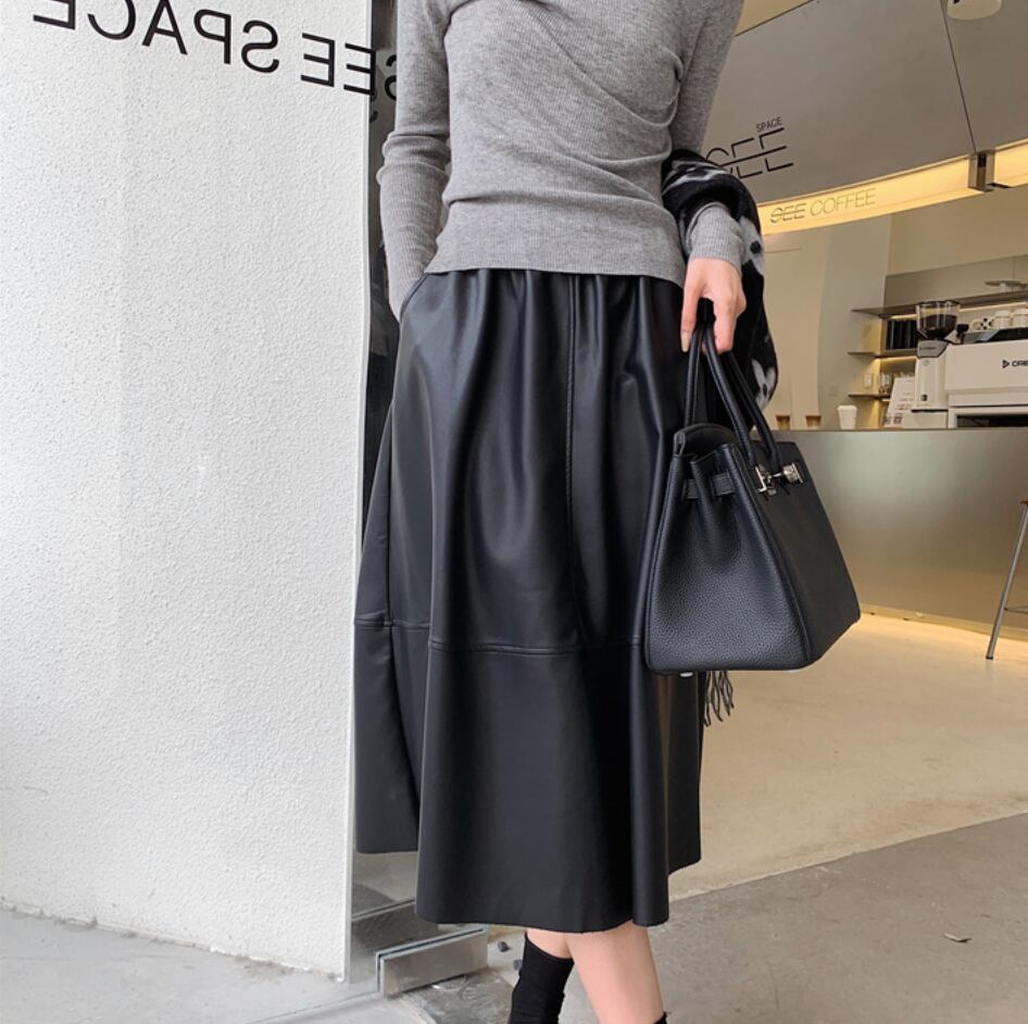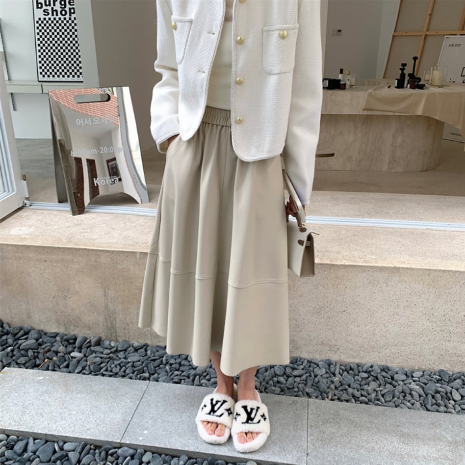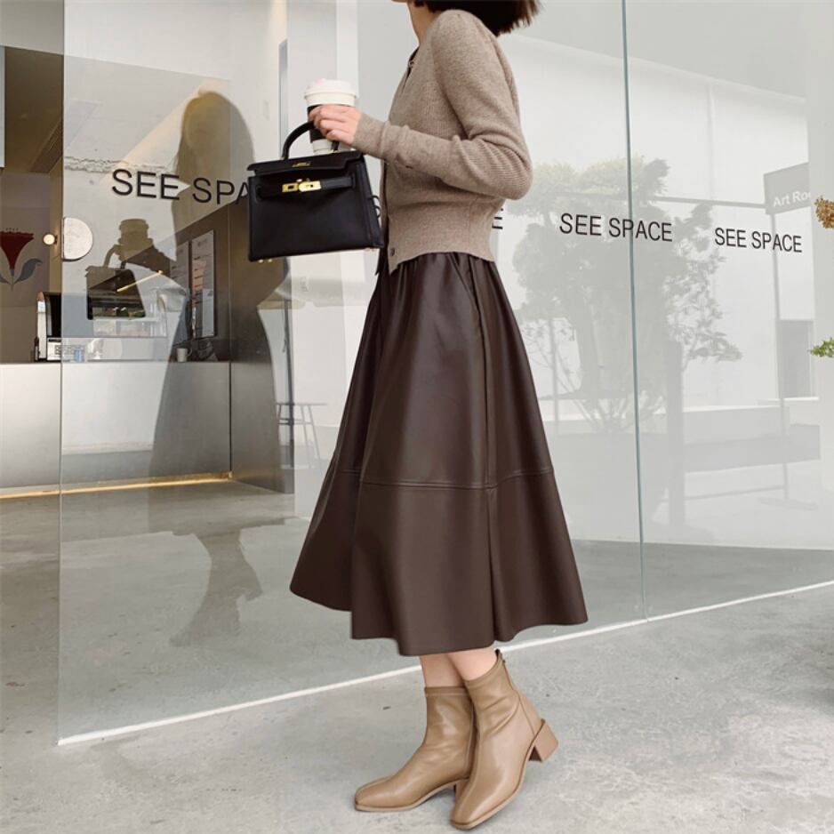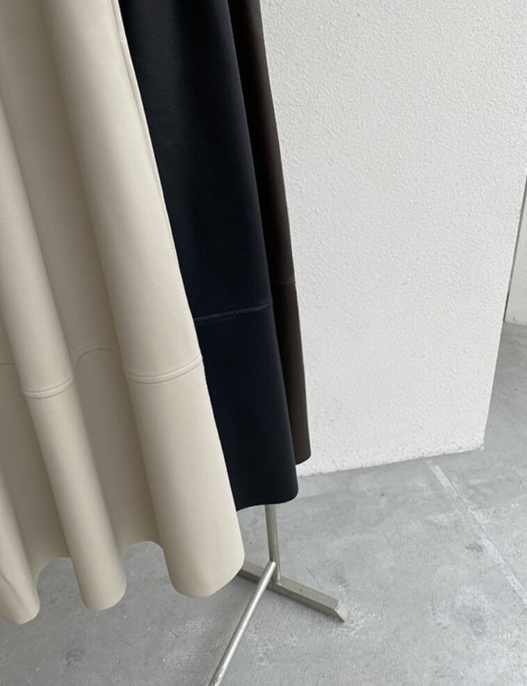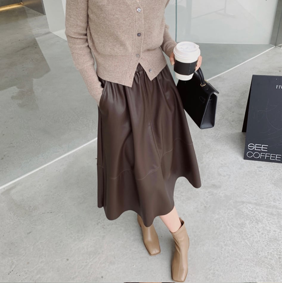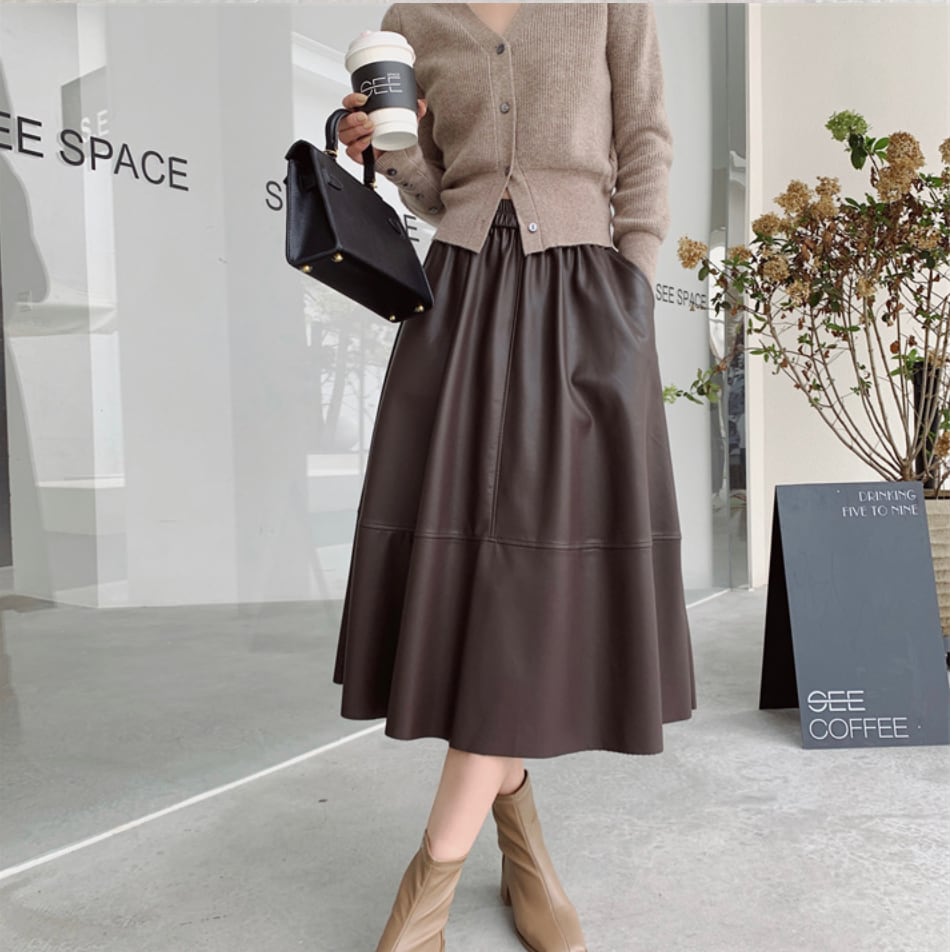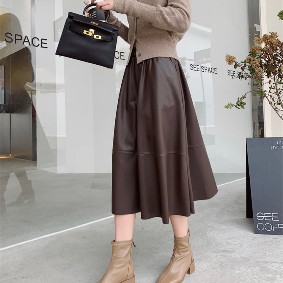 全3色|レザーAラインスカート|ミモレ丈・ポケット付き・きれいめ通勤